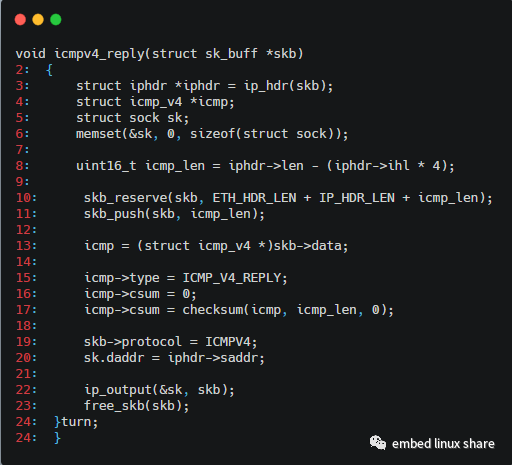第8行:用ip數(shù)據(jù)包的總長度-ip首部長度,得到icmp包總長度