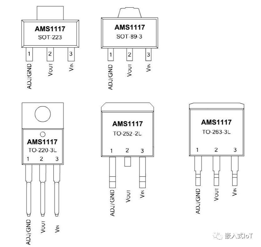 嵌入式中AMS1117芯片是比較常見的電源芯片種類,在很多開發(fā)板上都可以看到其身影。該芯片是一個正向穩(wěn)壓器。一共有兩個版本,可調(diào)節(jié)的版本ADJ和固定電壓輸出的版本。分別可輸出的電壓1.5V,1.8V,2.5V,2.85V,3.0V,3.3V,5.0V。
