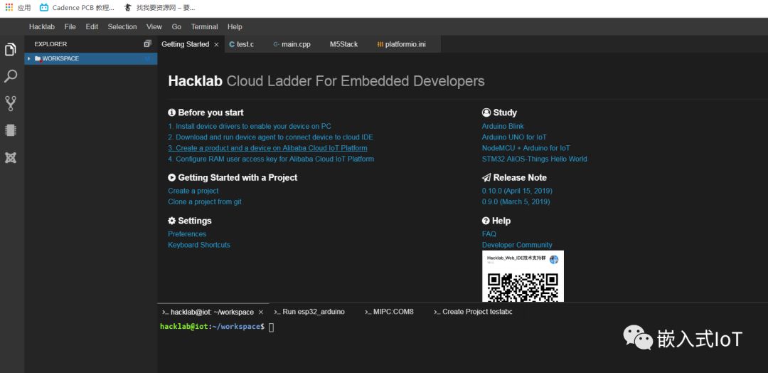 由于esp32用的是串口進(jìn)行下載,所以需要一個串口代理,將串口設(shè)備轉(zhuǎn)移到遠(yuǎn)程WebIDE上。阿里云的Hacklab就提供了這樣一個工具。