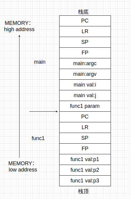 依次為當(dāng)前函數(shù)指針PC、返回指針LR、棧指針SP、?;稦P、傳入?yún)?shù)個數(shù)及指針、本地變量和臨時變量。如果函數(shù)準備調(diào)用另一個函數(shù),跳轉(zhuǎn)之前臨時變量區(qū)先要保存另一個函數(shù)的參數(shù)。