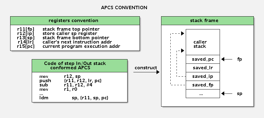 棧的回溯又分為兩種:APCS(ARM Procedure Call Standard)與unwind。
