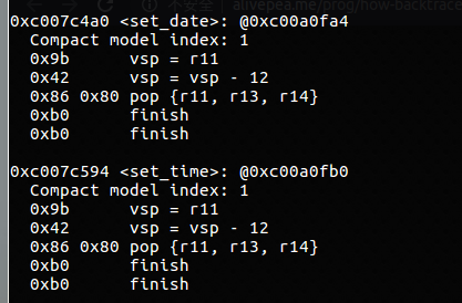回溯時根據(jù)pc值到段中得到對應(yīng)的編碼,解析這些編碼計算出lr在棧中的位置,進而計算得到調(diào)用者的執(zhí)行地址。