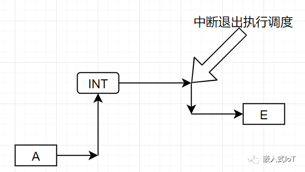 這種方式是在中斷中執(zhí)行調(diào)度的,當A線程正常運行時,此時來了一個中斷,由于中斷的優(yōu)先級是高于線程的。所以,中斷處理事情,如果在中斷中執(zhí)行了調(diào)度函數(shù),那么在中斷退出后,將直接切換到當前系統(tǒng)中更高優(yōu)先級的線程去運行。如果如果當前系統(tǒng)的最高優(yōu)先級還是A,那么中斷退出后,執(zhí)行的最高優(yōu)先級線程依然是A。若存在線程E線程優(yōu)先級高于A并且處于就緒狀態(tài),此時,中斷退出后,切換到E線程去執(zhí)行。
