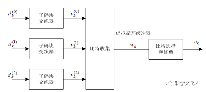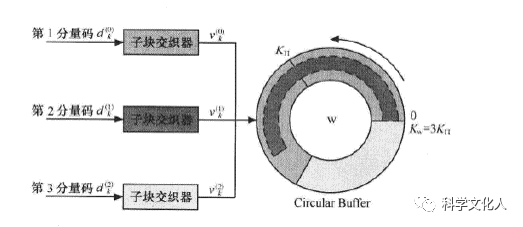 卷積編碼的3個(gè)分量碼各自經(jīng)過(guò)子塊交織后形成長(zhǎng)度為Kπ的數(shù)據(jù)流v^((0))、v^((1))、v^((2)),進(jìn)行連接后,形成長(zhǎng)度Kw=3Kπ的Circular