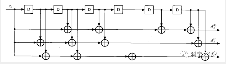 內(nèi)交織器:采用二次置換多項(xiàng)式(QPP)算法。輸入:c0, c1,…, c(k-1),輸出c0′, c1′,…, c_(k-1)′,關(guān)系:ci′=c(II(i))前后元素序號(hào)對(duì)應(yīng)關(guān)系:II(i)=(f1 i+f2 i^2)mod K,其中參數(shù)f1 和f2參見(jiàn)36.212 協(xié)議5.1.3.2.3節(jié)列表。n咬尾卷積編碼LTE物理層采用限制長(zhǎng)度位7的咬尾卷積碼進(jìn)行廣播信道/物理上下行控制信息信道編碼,碼率1/3,編碼多項(xiàng)式為G_0=133、G_1=171、G_2=165。6個(gè)寄存器初始狀態(tài)設(shè)置為編碼數(shù)據(jù)塊最后6個(gè)比特的數(shù)值,這樣卷積編碼的起始和結(jié)束是相同的,省去普通卷積碼方案中用于將結(jié)束狀態(tài)歸0的尾比特。卷積碼編碼器結(jié)構(gòu)如圖5所示。