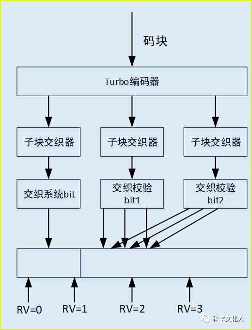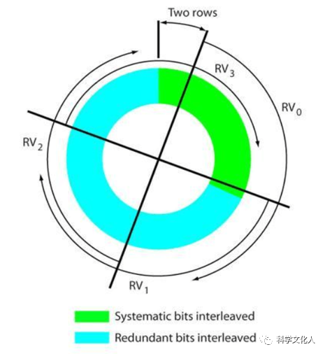 圖6 速率匹配過(guò)程nTurbo速率匹配Turbo編碼后的數(shù)據(jù)進(jìn)行速率匹配的過(guò)程,包括以每個(gè)碼塊為單位進(jìn)行“3個(gè)分量碼的子塊交織”、“形成circular buffer”以及“按照RV(Redundancy Version)和比特?cái)?shù)目選取本次發(fā)送的比特序列”。根據(jù)冗余版本RV和比特?cái)?shù)目進(jìn)選擇輸出,可以通過(guò)圖7所示的示意圖進(jìn)行理解。