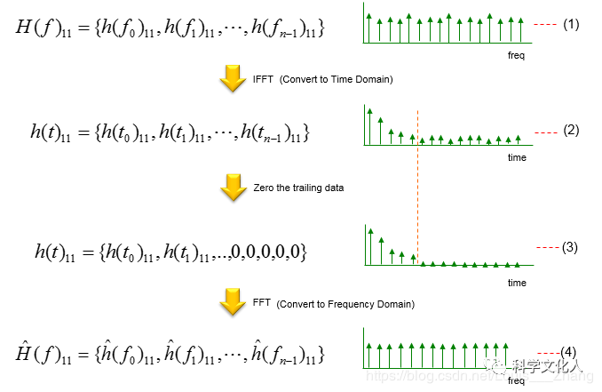 對于這些數(shù)組中的每一個,我將進行如下所示的相同處理。(每個芯片組制造商都可以應(yīng)用稍微不同的方法,但是總體思路是相似的)。在下面說明的方法中,數(shù)據(jù)(每個頻點中的信道系數(shù)陣列)使用IFFT進行處理,這意味著將頻域轉(zhuǎn)換為時域,從而生成標記為(2)的時域數(shù)據(jù)陣列。實際上,這是特定信道路徑的脈沖響應(yīng)。然后,我們對該時域數(shù)據(jù)應(yīng)用特定的過濾(或加窗)。在此示例中,將某個點的數(shù)據(jù)替換為零,并創(chuàng)建標記為(3)的結(jié)果。您可以應(yīng)用更復(fù)雜的過濾器或窗口,而不是這種簡單的調(diào)零。然后,通過將濾波后的信道脈沖數(shù)據(jù)轉(zhuǎn)換回頻域。