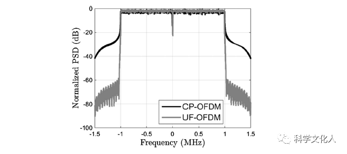 通過對(duì)一組子載波(子帶)進(jìn)行濾波,合成了高頻OFDM波形改善每個(gè)子載波組(子帶)的頻譜形狀(減少OOB泄漏)。子載波組(子帶)濾波是根據(jù)蜂窩系統(tǒng)(如LTE和NR)的調(diào)度操作是基于子帶(資源塊)進(jìn)行的。子帶濾波改善了頻譜特性。 在4G LTE和5G NR中,一個(gè)資源塊由12個(gè)子載波組成。CP-OFDM與UF-OFDM的頻譜對(duì)比,如下圖所示。