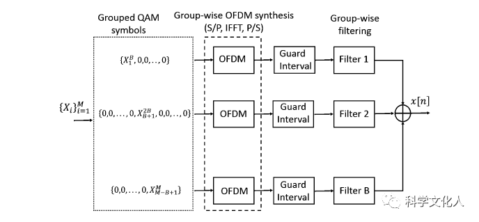 UF-OFDM的發(fā)射機(jī)結(jié)構(gòu)如下圖所示,在UF-OFDM調(diào)制器中,為了實(shí)現(xiàn)無干擾濾波,需要一個(gè)保護(hù)間隔。