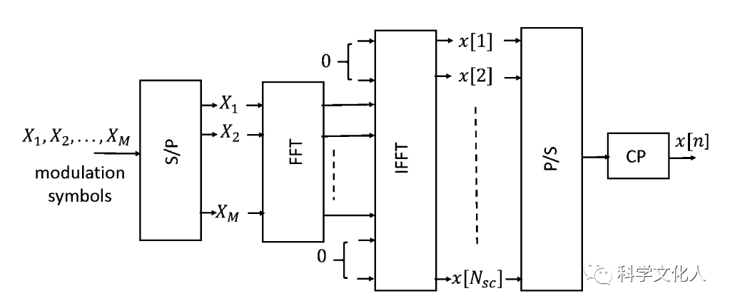 DFTS-OFDM可以看作是一種基于DFT的預(yù)編碼的OFDM波形單載波。DFTS-OFDM調(diào)制發(fā)射機(jī)結(jié)構(gòu)如下圖所示。相比于CP-OFDM,采用DFTS-OFDM,可以降低峰均比PAPR。DFTS-OFDM用于4G LTE的上行傳輸,因?yàn)樗岣吡斯β市?。它也?/span>5G NR上行可選的波形。
