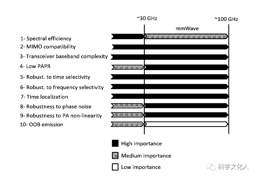 不同頻率范圍內(nèi)的波形KPI對(duì)NR操作的重要性,如下圖所示。我們注意到,對(duì)于毫米波通信,需要特別注意硬件損傷和功率效率,頻率定位不是很重要。