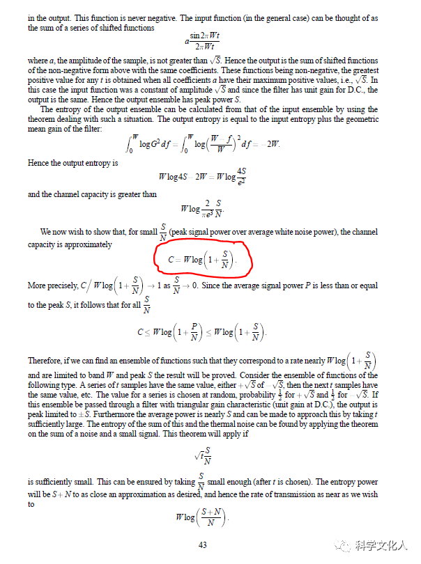 在1948年,香農(nóng)發(fā)表了“A Mathematics Theory of Communication”(通信的數(shù)學(xué)理論)一文,標(biāo)志著信息論的誕生。什么,一篇論文就開啟了一個(gè)新的學(xué)科理論?大概這就是祖師爺與打工人的區(qū)別所在。這篇論文,一共54頁,在這里,筆者把那個(gè)優(yōu)美且偉大的公式,在原文中的位置貼出來,膜拜: