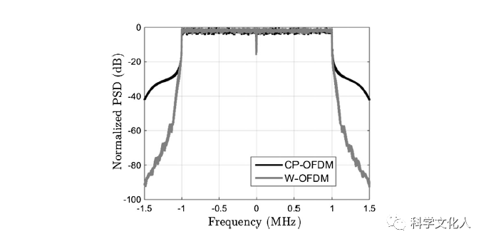 CP-OFDM的頻譜衰減相當(dāng)緩慢。其緩慢衰減的主要原因是信號(hào)OFDM中使用的矩形脈沖形狀導(dǎo)致符號(hào)邊界不連續(xù)。為了改善OFDM的頻譜形狀,可以采用邊緣光滑的非矩形脈沖形狀,稱之為加窗OFDM(W-OFDM)。W-OFDM和CP-OFDM的頻譜對(duì)比如下圖,我們觀察到W-OFDM具有更清晰的頻譜擴(kuò)展。信號(hào)的頻譜滾降越清晰,就越容易滿足3GPP為蜂窩系統(tǒng)規(guī)定的帶外(OOB)泄漏要求。