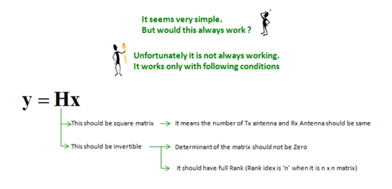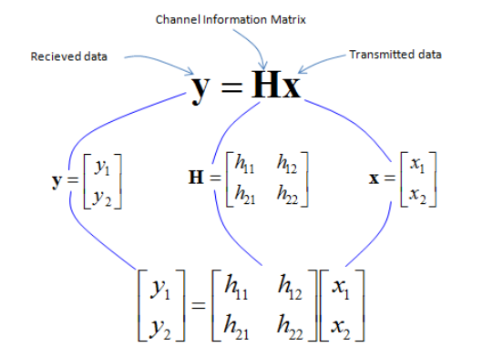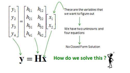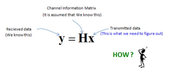 假設我們已經(jīng)有了關于信道矩陣(H)的所有信息,現(xiàn)在的問題就是用x來解下面的方程,也就是在下面的方程中求出x。(你可能會問我們怎么知道“H”,但我們就假設它已經(jīng)給我們了。這是另一個大的主題,應該作為一個單獨的頁面來涵蓋)。