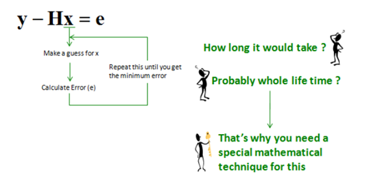 在這種情況下,您不能得到任何精確解(精確答案),但是您可以通過各種技術得到近似答案。在這種情況下,我們使用的常見技術之一是“最小二乘誤差(LSE)”方法,其總體邏輯如下。
