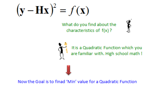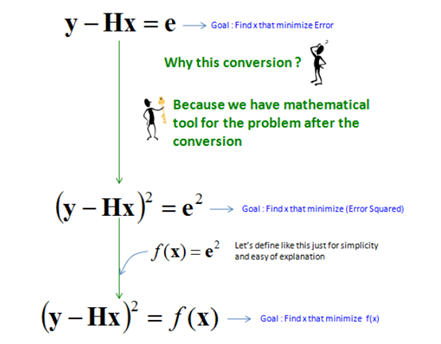 讓我們用數(shù)學方法來解決這個問題,而不是做無休止的瘋狂(盲目)猜測。我們的目標是找到使e最小的x。通過兩邊平方,我們可以得到一個數(shù)學形式,這個值的最小值(或最大值)可以用解析方法找到。(如果你不熟悉最小二乘誤差法,你的第一個問題可能是“為什么我們需要得到方程的平方?”這是一個非常好的問題和重要的問題。但我不想詳細解釋,因為那會偏離我們的話題太多。然而,我強烈建議你試著閱讀一些關于“最小二乘”或“最小二乘誤差”方法的材料)。