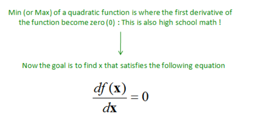 從高等數(shù)學中,你會想起任何二次函數(shù)。函數(shù)的一階導數(shù)(切線斜率)在最小(或最大)位置為0。