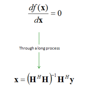 通過一個漫長而乏味的過程(為了不讓你感到無聊,我不會去做所有的步驟),它會給你如下所示的最終答案。重要的是你可以通過y和H得到x的最佳近似值。有人可能不熟悉另一個符號'H'在上標。它是厄米特矩陣符號。如果你能保證信道矩陣的所有元素都是實數(shù),你可以使用'轉(zhuǎn)置'矩陣,但它不能覆蓋信道矩陣有任何復數(shù)元素的情況。厄密特矩陣既能處理實矩陣,又能處理復數(shù)矩陣,因此使用厄密特矩陣是安全的。