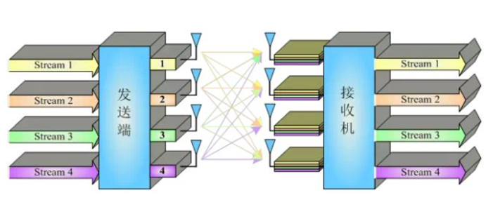 在空分復(fù)用中,不同的信息可以在多個天線上同時傳輸,類似于OFDM信號的思想,從而提高系統(tǒng)吞吐量或信道容量。