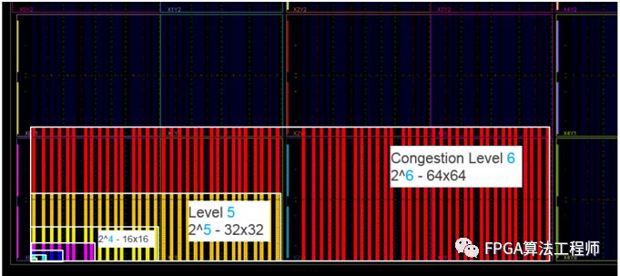 Xilinx FPGA布線結(jié)構(gòu)包括東、南、西、北共4個(gè)方向不同長(zhǎng)度的互聯(lián)資源。擁塞區(qū)域以最小的正方形體現(xiàn),這個(gè)正方形覆蓋了相鄰的互聯(lián)資源或CLB單元。