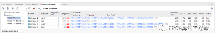 為幫助識(shí)別擁塞,Report Design Analysis命令支持生成擁塞報(bào)告以顯示器件的擁塞區(qū)域,以及這些區(qū)域內(nèi)存在的設(shè)計(jì)模塊的名稱。此報(bào)告中的擁塞表會(huì)顯示布局器和布線器算法發(fā)現(xiàn)的擁塞區(qū)域。下圖顯示了擁塞表示例。