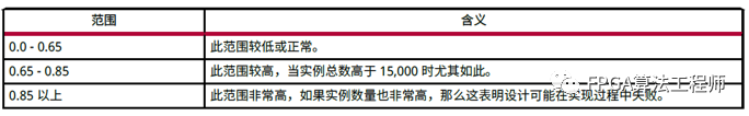 分析擁塞時(shí),工具報(bào)告的等級(jí)可按下表所示方式進(jìn)行分類。擁塞等級(jí)為 5 或更高時(shí),通常會(huì)影響 QoR 并且必然會(huì)導(dǎo)致布線器運(yùn)行時(shí)間延長(zhǎng)。
