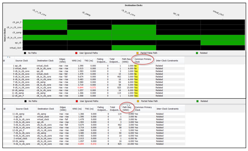第二步,可以對“Path Req (WNS)”由小到大進(jìn)行排序,找到那些數(shù)值特別?。ɡ缧∮?/span> 100ps)或是顯示 為“Unexpanded”的 CDC 路徑,結(jié)合是否共享“Common Primary Clock”來鑒別此類路徑,作出合理的約束。