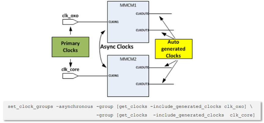 在 XDC 中,對于此類設(shè)計(jì)的 CDC 路徑,可以采用 set_clock_groups 來約束。