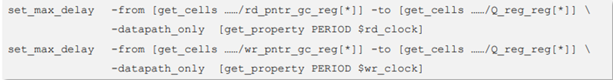 所以建議的做法是不設(shè) set_clock_groups 約束,轉(zhuǎn)而采用 set_max_delay 來約束這些跨時(shí)鐘域路徑。以寫入側(cè)舉例,一個(gè)基本的原則就是約束從 cell1 到 cell2 的路徑之間的延時(shí)等于或略小于 cell2 的驅(qū)動(dòng)時(shí)鐘一個(gè)周期的值。讀出側(cè)的約束同理。