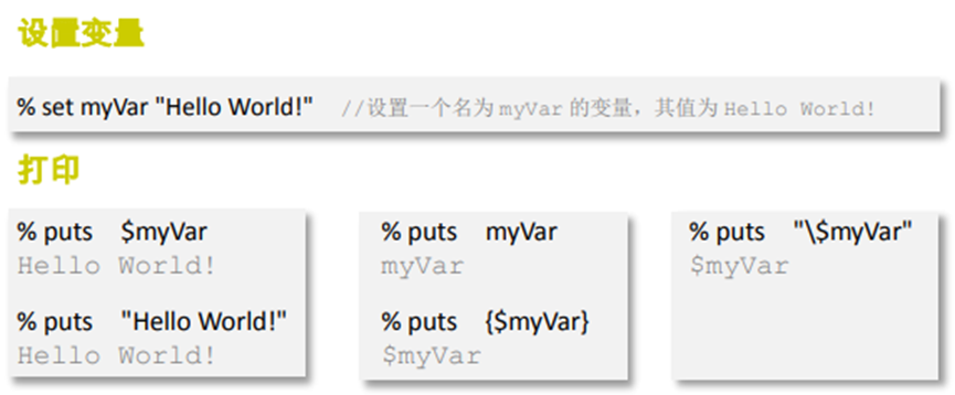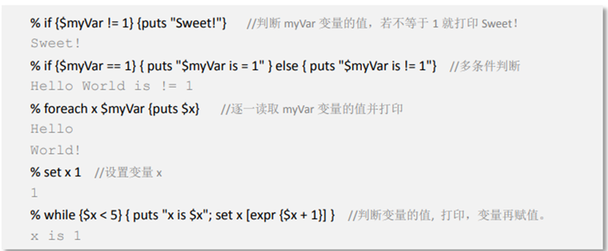 注:在以下示例中,% 表示 Tcl 的命令提示符,執(zhí)行回車后,Tcl 會在下一行輸出命令執(zhí)行結果。 // 后是作者所加注釋,并不是例子的一部分。