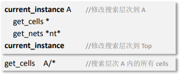 若要將搜索層次改為 A+B+b1,則可以寫一個循環(huán),逐一用 current_instance 將搜索層次指向 A,B 和 b1,再將搜索到的 cells 或 nets 合成一個 list 輸出即可。