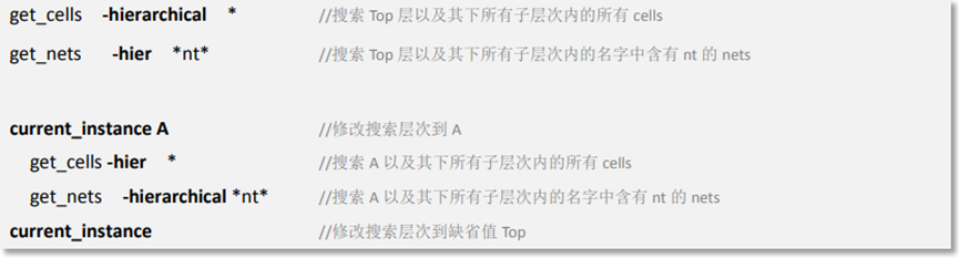 若要將搜索層次改為當前層次以及其下所有子層次,可以使用 -hierarchical (在 Tcl 中可以簡寫為-hier)