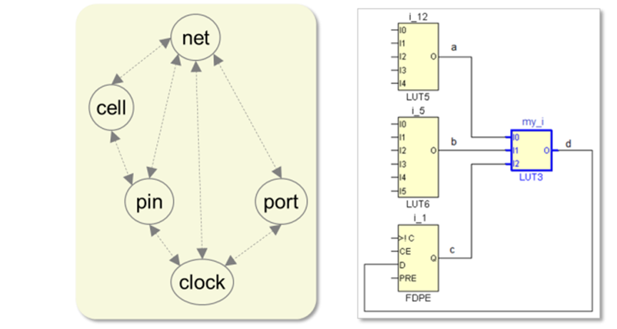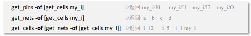 Tcl 在搜索網表中的目標時,除了上述根據名字條件直接搜索的方式,還可以利用目標間的關系,使用 -of_objects(在 Tcl 中可以簡寫為-of)來間接搜索特定目標。Vivado 中定義的五類目標間的關系如下頁左圖所示。