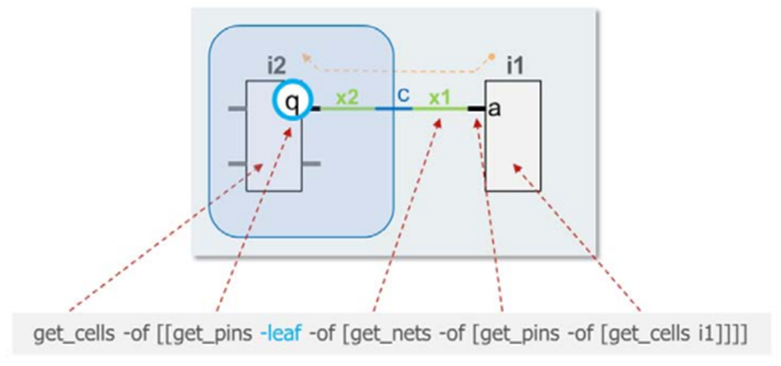 下圖是一個更復雜的示例,涉及跨層次搜索??梢钥吹皆?/span> get_pins 時,要加上-leaf 才能準確定位到門級 元件(或 blackbox)的端口 q。另外,在實際操作中,使用get_nets 和 get_pins 時,需要視情況而加上其它 條件(-filter)才能準確找到下述例子中的 cells (i2) 。