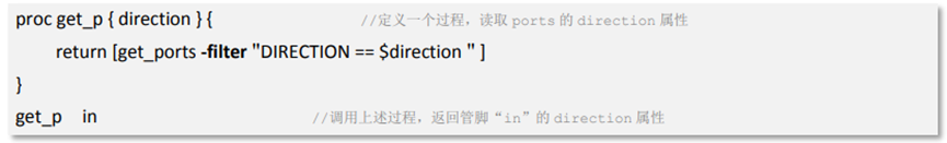 在創(chuàng)建子程序時也常常用到-filter,例如下述 get_p 的子程序/過程就可以用來返回指定管腳的方向屬性,告訴用戶這是一個輸入管腳還是一個輸出管腳。需要特別指出的是,通常在-filter 后會使用{ },但此時需要對 $direction 做變量替換,必須如下所示改用" " 。