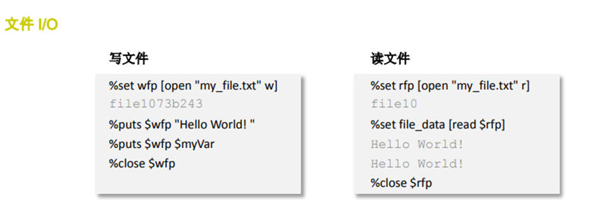 可以看到 Tcl 對文件的操作也是通過設置變量,改變屬性以及打印命令來進行的。上述寫文件的例子中通過 puts 命令在 my_file.txt 文件中寫入兩行文字,分別為“Hello World!” 和 myVar 變量的值,然后在讀文件操作 中讀取同一文件的內容。