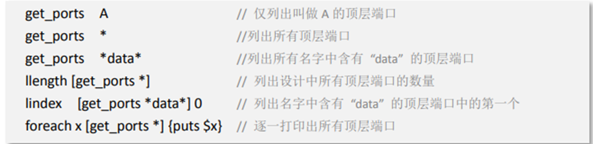ports 僅指頂層端口,所以get_ports 的使用相對簡單,可以配合通配符“* ”以及 Tcl 語言中處理 list 的命令一起使用。如下所示,
