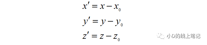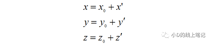 假設(shè)點P是空間中的任意一點,其在XYZ坐標系中的坐標為(x, y, z)?,F(xiàn)在點P不動,我們將XYZ坐標系做一個平移的操作,把XYZ平移到X′Y′Z′的位置,O′是平移后的坐標的原點,要注意的是,O′在XYZ中的坐標為(x0, y0, z0)。點P在XYZ坐標系中的坐標為(x, y, z),點P在平移后的坐標系X′Y′Z′中的坐標為(x′, y′, z′)。根據(jù)上面這個示意圖,聰明的你一下就可以發(fā)現(xiàn):