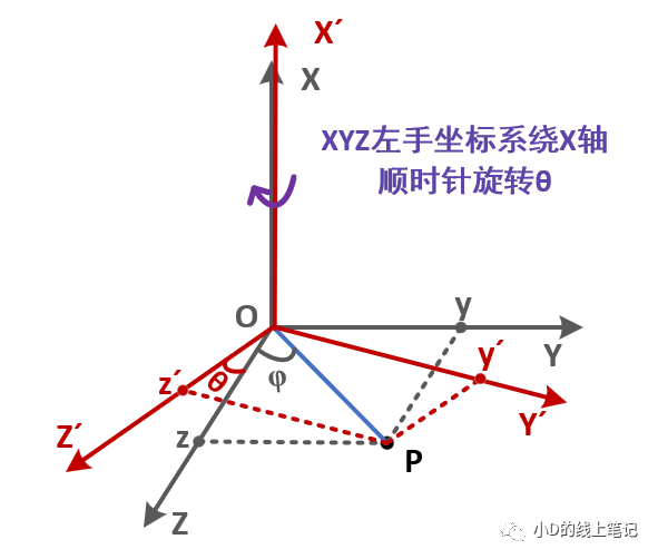 XYZ左手坐標系繞X軸順時針旋轉(zhuǎn)θ角的過程示意圖如下所示:
