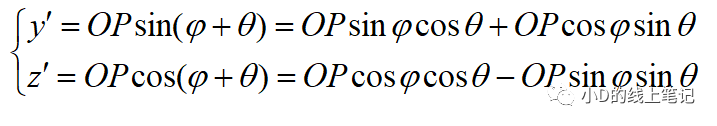把x,z帶入x′,z′中,同時P點在XYZ中的Y軸坐標與其在X′Y′Z′坐標系中的Y′軸坐標是相等的,所以有: