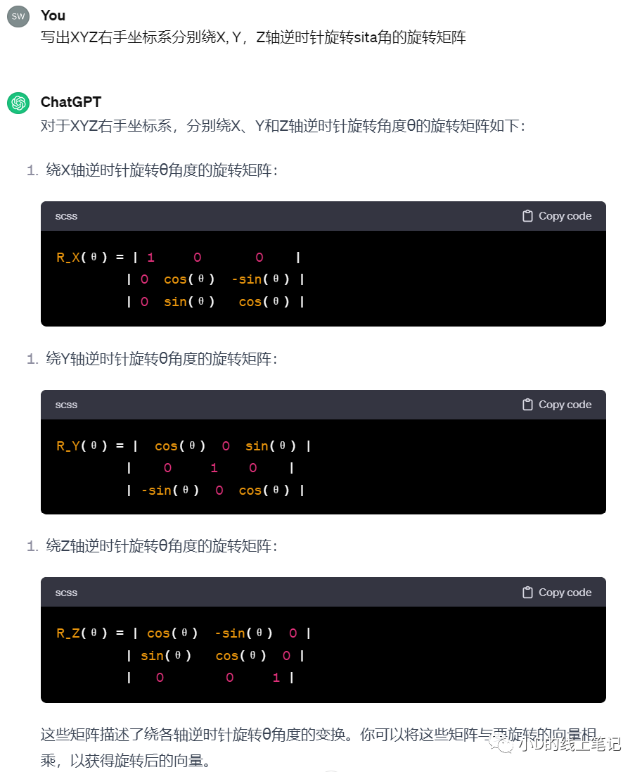 很顯然,gpt給出的右手坐標系的旋轉(zhuǎn)矩陣不是小D上面推導(dǎo)的結(jié)果,也跟書中的結(jié)果不一樣。于是小D又去問了gpt4,gpt4的回答是這樣的: