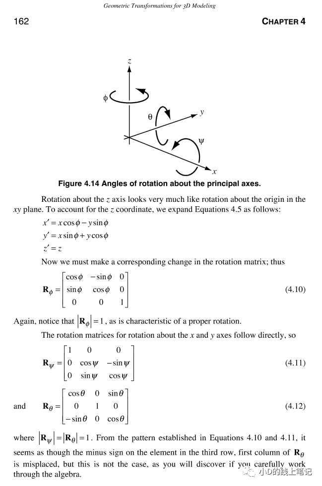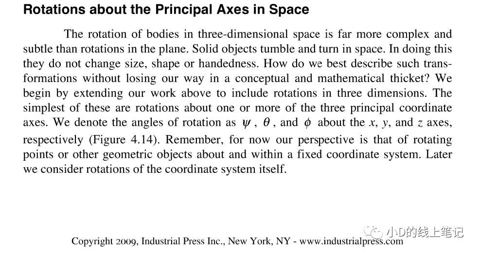gpt4的回答和gpt3.5的回答如出一轍,當(dāng)時小D心想,gpt腦子估計又瓦特了。直到最近,小D看到了一本英文書籍Geometric Transformations for 3D Modeling_Michael Mortenson,小D才明白,原來gpt是沒有正確理解問題,它給出的是坐標系中的點轉(zhuǎn)動,坐標軸不動的情況。這本英文書籍中坐標轉(zhuǎn)換相關(guān)的內(nèi)容是這樣的: