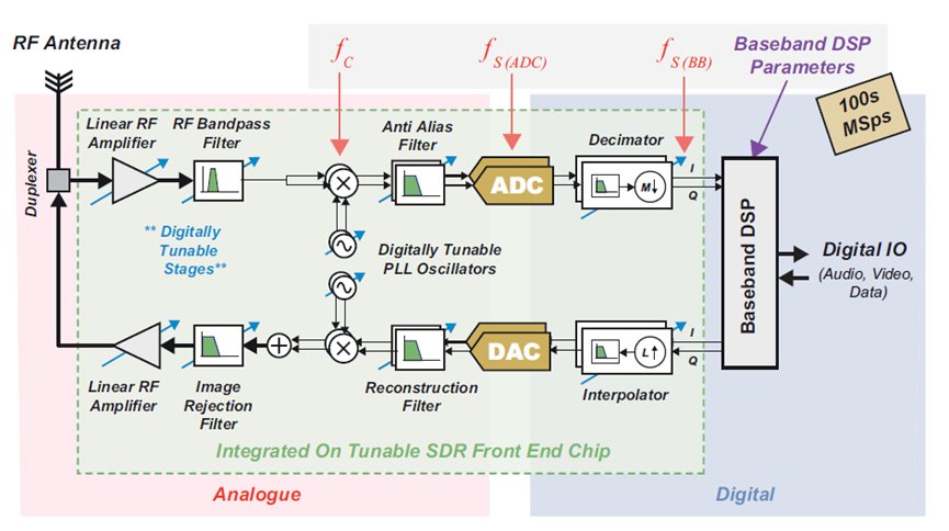圖5:帶可調(diào)諧射頻的基帶采樣SDR的系統(tǒng)級實現(xiàn)