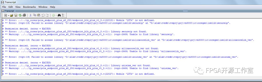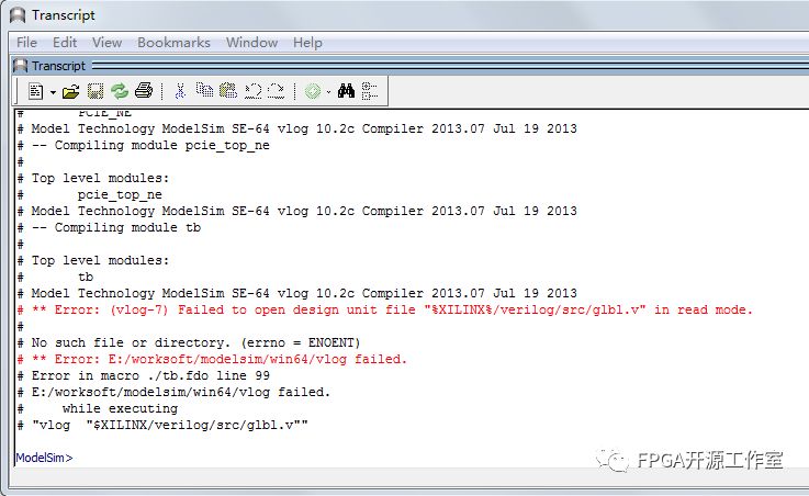 圖7,為運(yùn)行過程中的第一個(gè)錯(cuò)誤# ** Error: (vlog-7) Failed to open design unit file "%XILINX%/verilog/src/glbl.v" in read mode.修改到你的正確路徑。例如圖8。