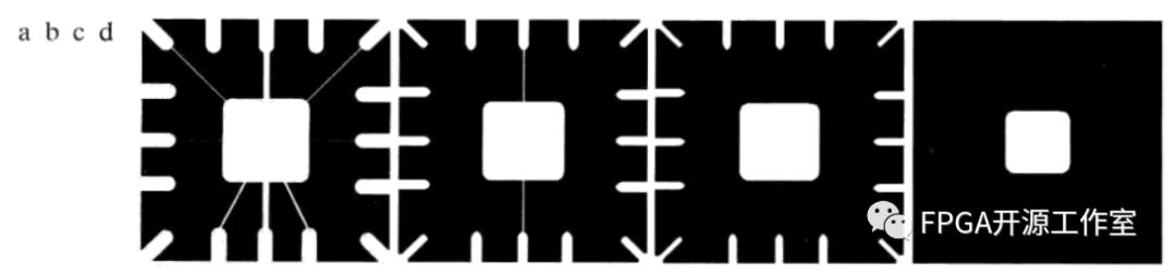 圖1 a一幅大小為486x486的連線模板二值圖像,圖1b~d分別使用11x11,15X15和45X45的模板進(jìn)行腐蝕。我們從這個(gè)例子看到,腐蝕縮小或細(xì)化了二值圖像中的物體。事實(shí)上,我們可以將腐蝕看成是形態(tài)學(xué)濾波操作,這種操作將小于模板的圖像細(xì)節(jié)從圖像中濾除。