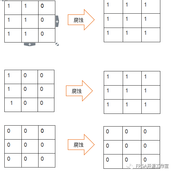 在二值圖像的腐蝕算法過程中我們使用二值圖像3x3圖像矩陣,由圖2可知,當(dāng)九個(gè)格子中不全為‘0’或者‘1’時(shí),經(jīng)過腐蝕算法后九個(gè)格子的值最終都會(huì)變成‘1’;如果九個(gè)全是‘1’或者‘0’時(shí),那么最終的結(jié)果九個(gè)全是‘1’或者‘0’。