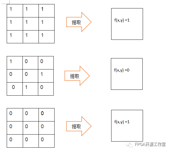 我們使用3x3模板進(jìn)行邊界提取,所以當(dāng)3x3九個點都是‘1’的時候,輸出為‘1’,當(dāng)九個點都是‘0’的時候,輸出為‘1’,其他情況輸出均為‘0’。