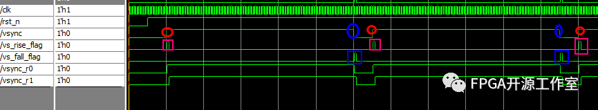 如上圖所示,紅色的圓圈表示vsync的上升沿,紅色正方形框表示vsync的上升沿標(biāo)志;藍(lán)色的圓圈表示vsync信號的下降沿,藍(lán)色框表示vsync的下降沿標(biāo)志。