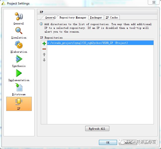 1)添加IP 點(diǎn)擊Project Setting->IP->Repository Manager->+(找到自己IP存放的路徑)->OK.