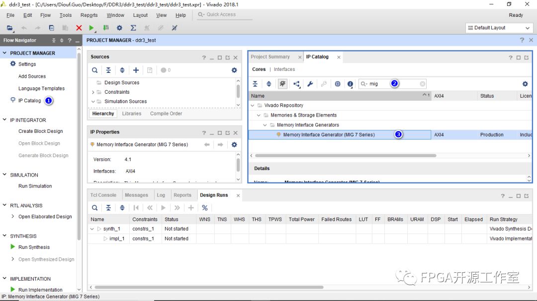 1>點擊IP Catalog ->搜索mig->雙擊Memory Interface Generator(MIG 7 Series)